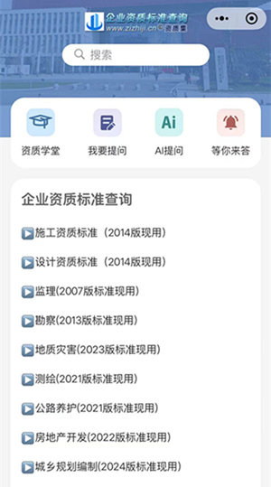 区别于需要下载安装的独立应用,《新资质标准》小程序依托于微信,实现了真正的“即开即用”。用户无需下载安装,只需在微信首页的搜索框中输入“新资质标准”,即可直接点击进入小程序主界面,享受与App一致的全功能服务,极大降低了使用门槛。